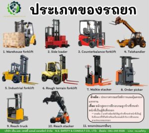 การฝึกอบรมรถยกในแต่ละประเภทนั้นไม่เหมือนกันเช่น รถยก รถบูมลิฟท์ รถกระเช้า แฮนลิฟท์ เอ็กลิฟท์ เป็นต้น พนักงานจะต้องมีความรู้ในการทำงานกับรถยกที่ตัวเองใช้งานอยู่รวมไปถึงมีความรู้เกี่ยวกับการบำรุงรักษาให้รถยกแต่ละประเภทสามารถทำงานได้อย่างเต็มประสิทธิภาพ